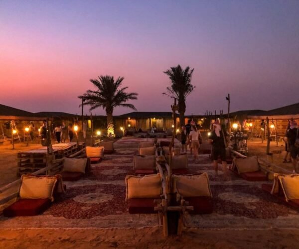 - Traditional camp setup with Arabic tea, shisha, and cultural ambiance